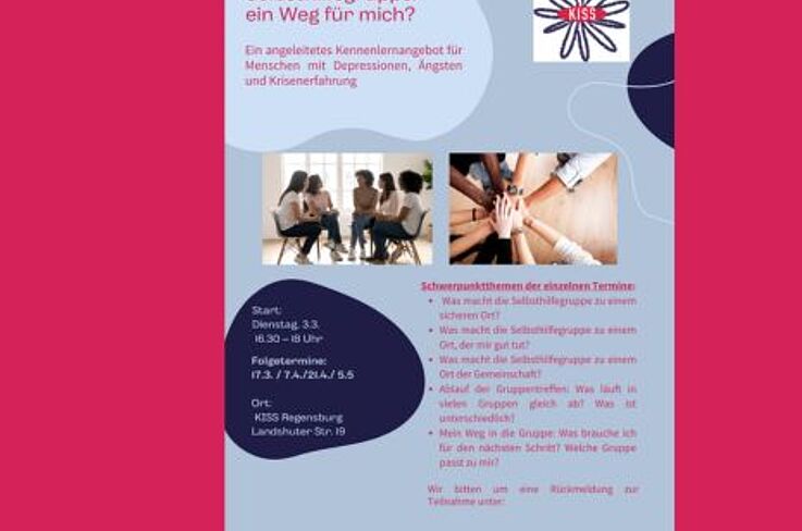 Bei KISS erfahren Sie, welche Gruppen es im Raum Regensburg gibt. Unsere Berater*innen versuchen mit Ihnen gemeinsam das passende Angebot oder die richtige Anlaufstelle zu finden.