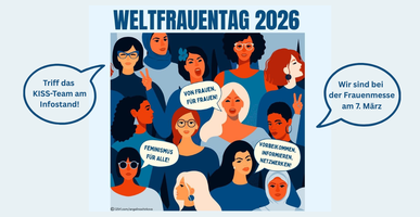 Unser KISS Team ist zur Feier des Weltfrauentages auf der diesjährigen Frauen*messe mit einem Aktionsstand vertreten. Unsere Beraterinnen informieren zu Gruppen, Veranstaltungen, Fortbildungen und weiteren Angeboten der Selbsthilfe. Außerdem gibt es an unserm Stand die Aktion "Nimm dir dein Stück vom Kuchen!" mit inspirierenden Botschaften von und für starke Frauen*
